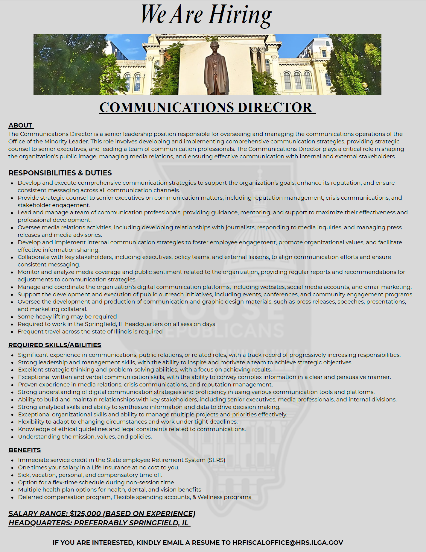 Job Summary: The Communications Director is a senior leadership position responsible for overseeing and managing the communications operations of the Office of the Minority Leader. This role involves developing and…